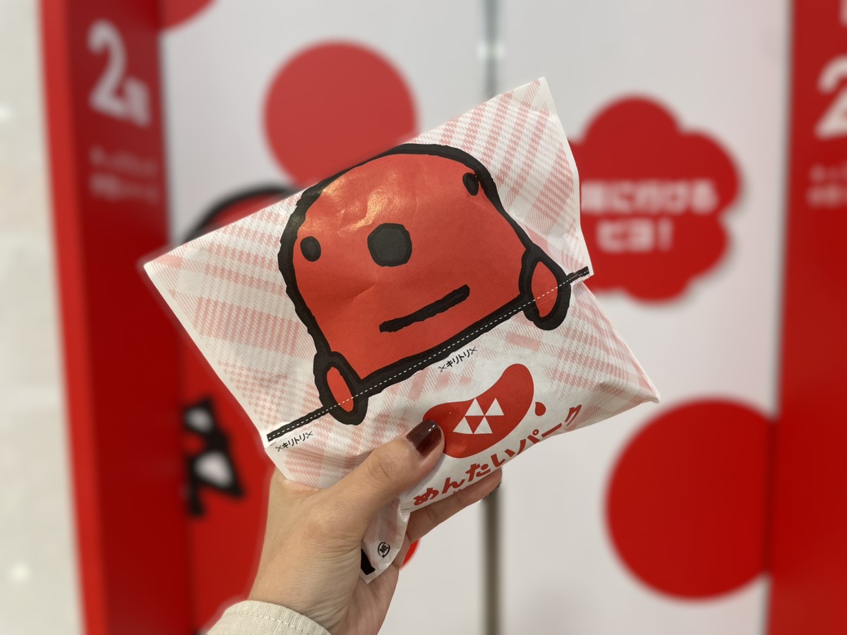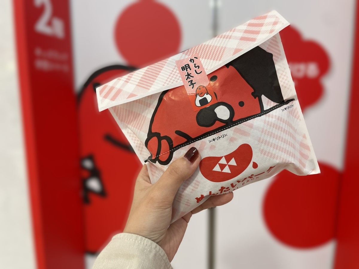 袋のデザインにもこだわり、かねふくめんたいパークのキャラクター、「タラピヨ」と「タラコン博士」が両面ミシン目に沿って描かれています!